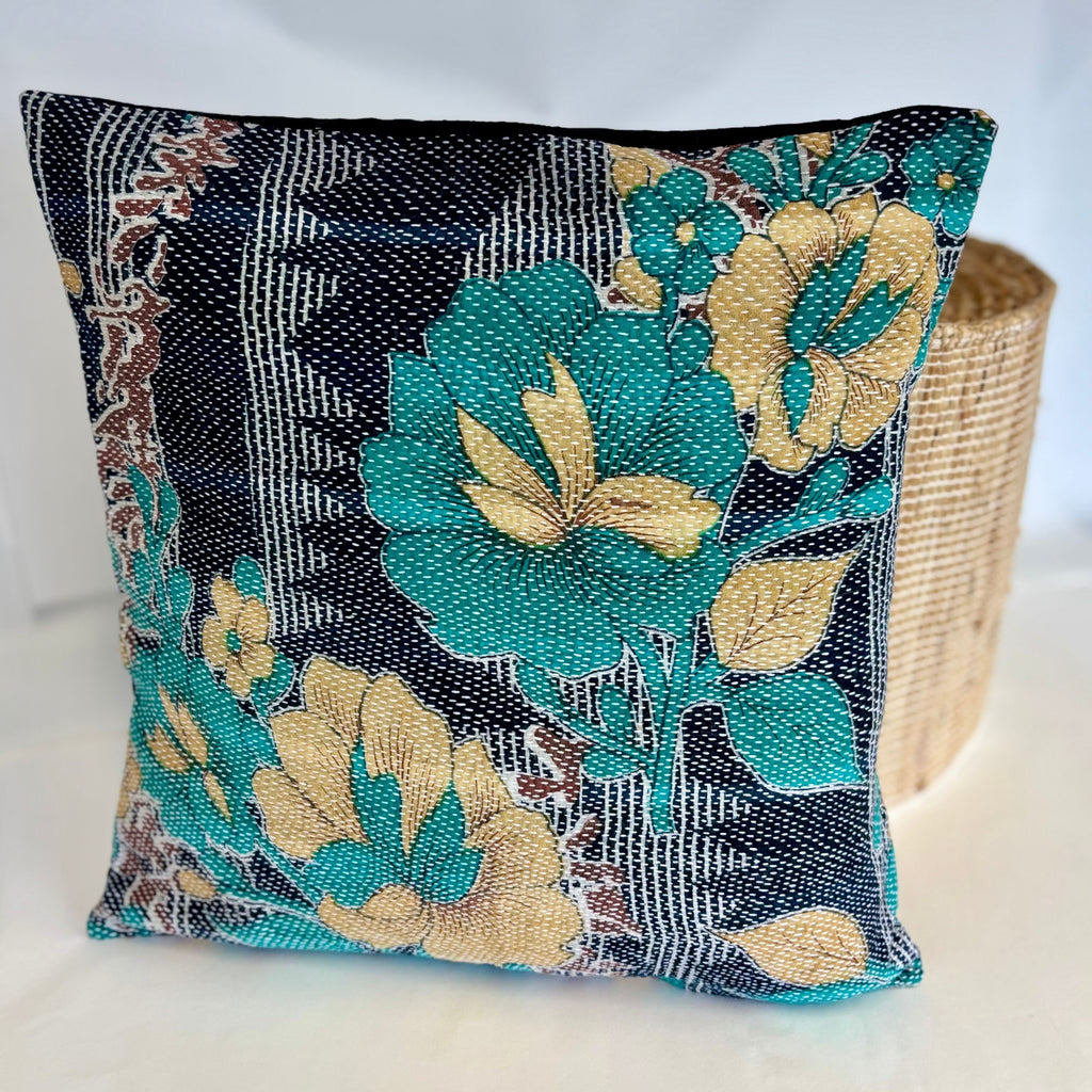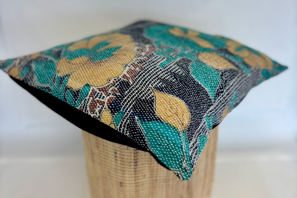 Kantha Stitch Cushion Cover - Blue, Teal & Mustard
