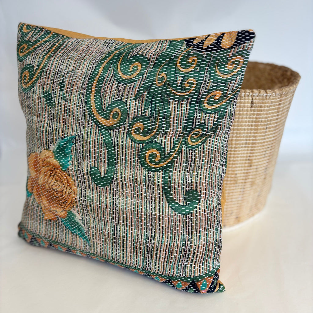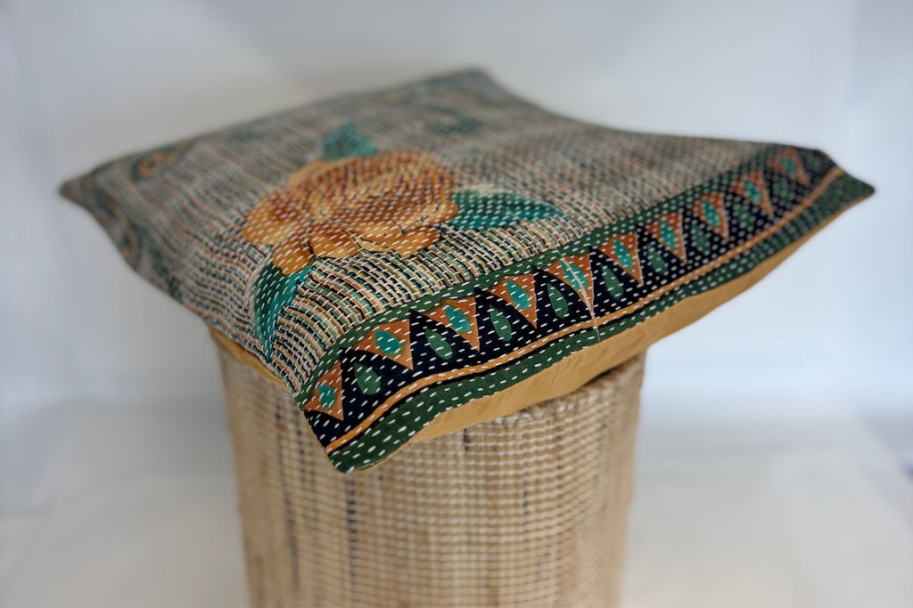 Kantha Stitch Cushion Cover - Gold Rose, Teal Stripe